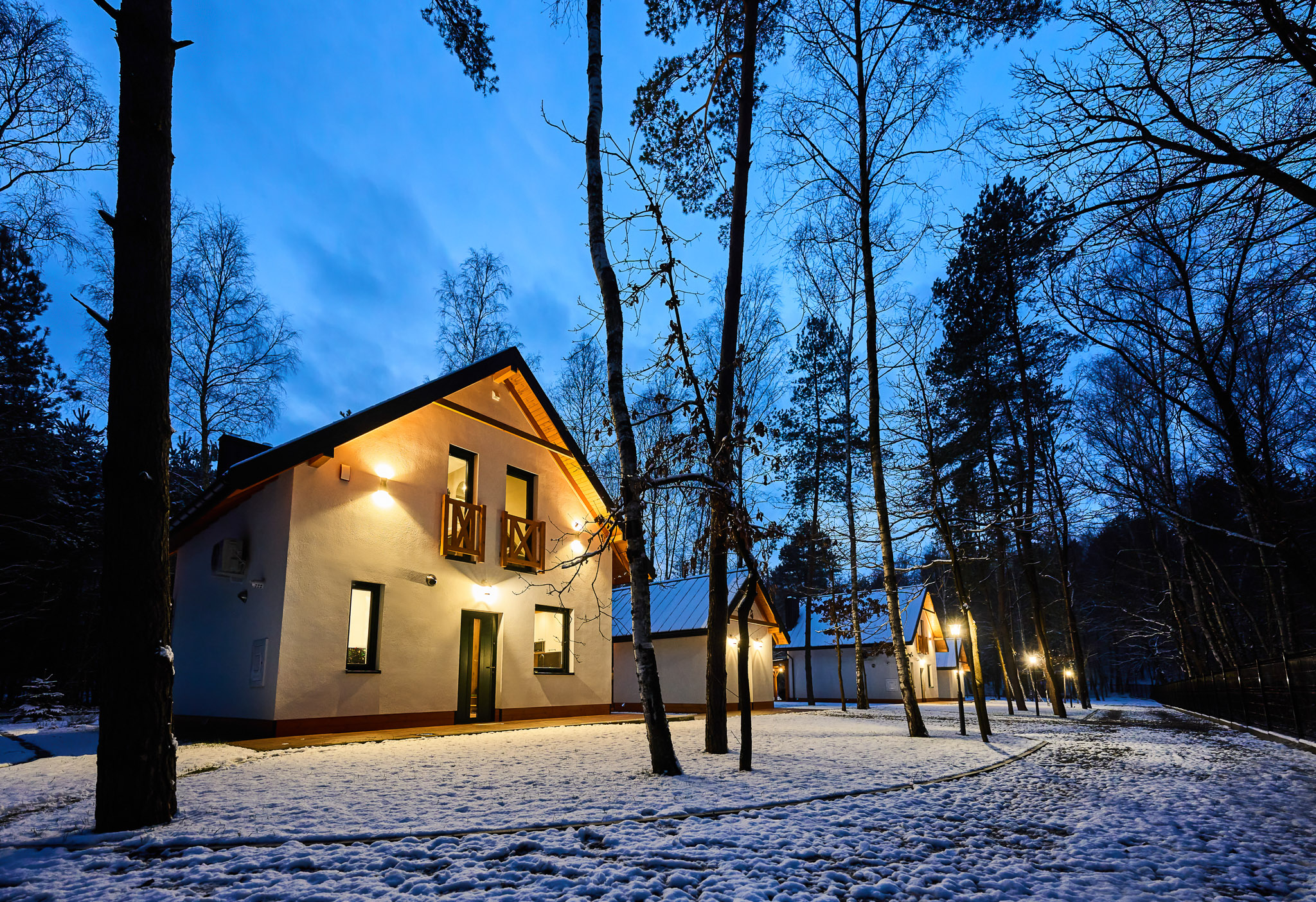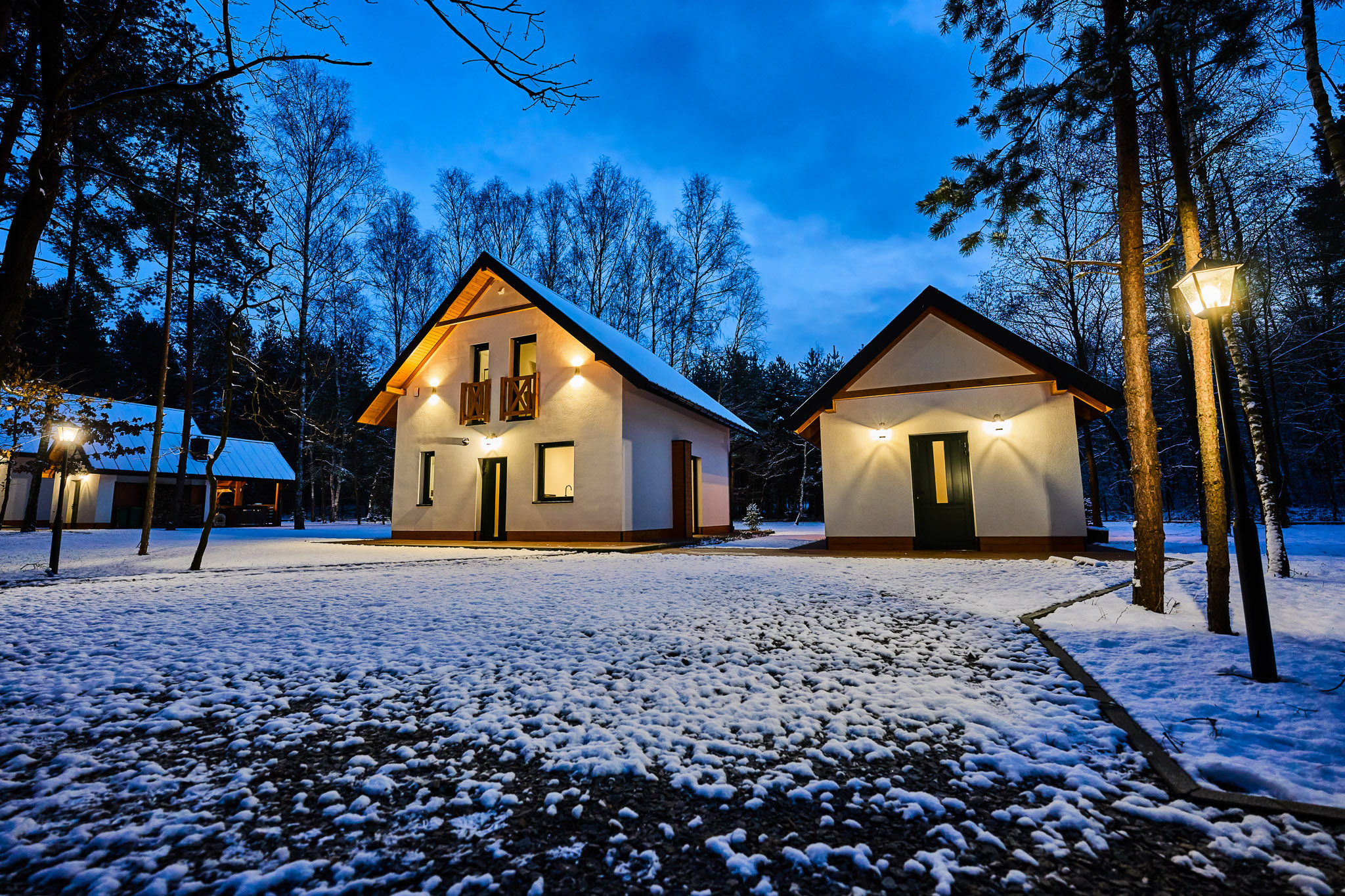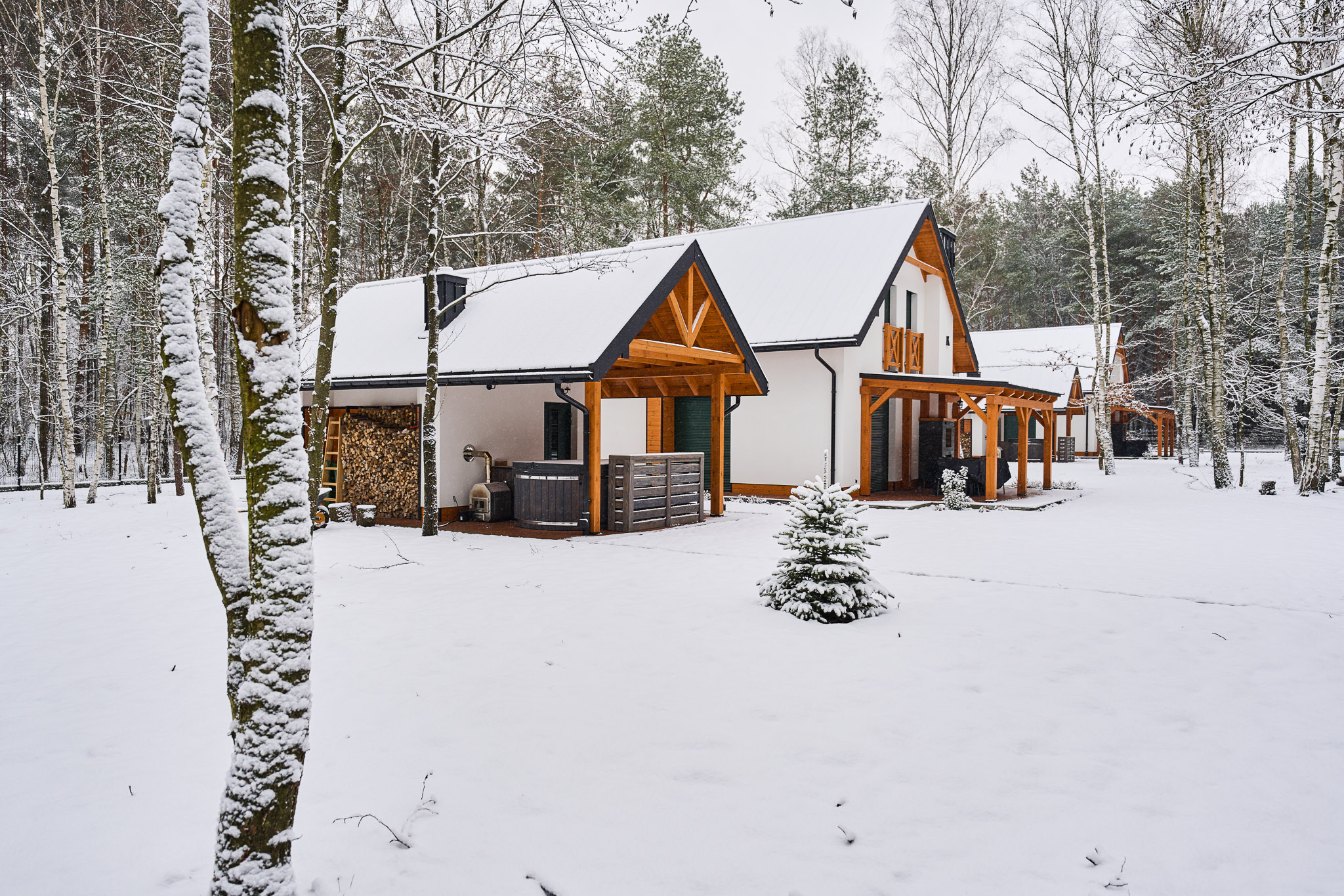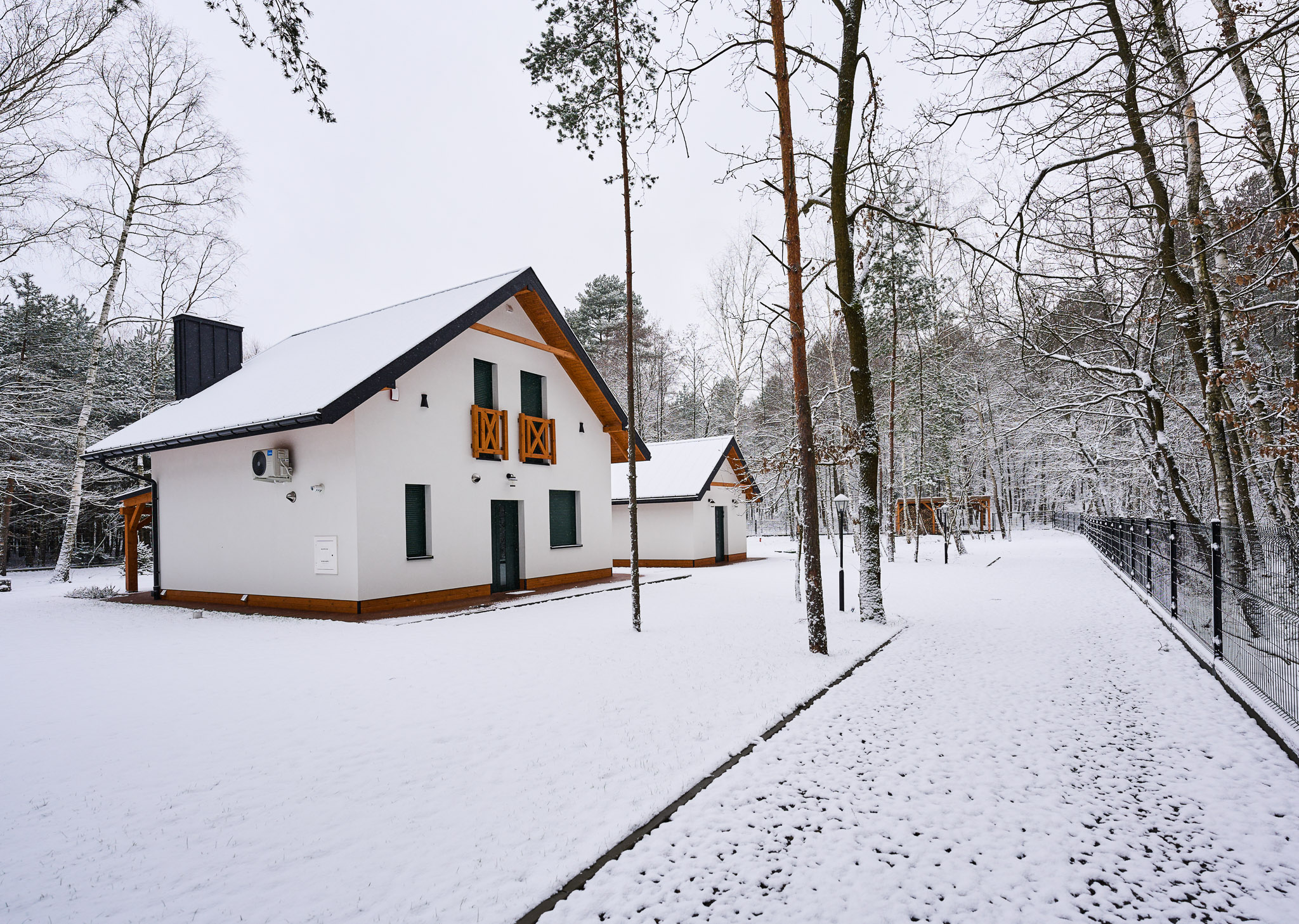 Przestronne wnętrza domków zapewniają wygodę, a ich stylowy wystrój doskonale komponuje się z otaczającą przyrodą, tworząc idealne warunki do odpoczynku i relaksu.