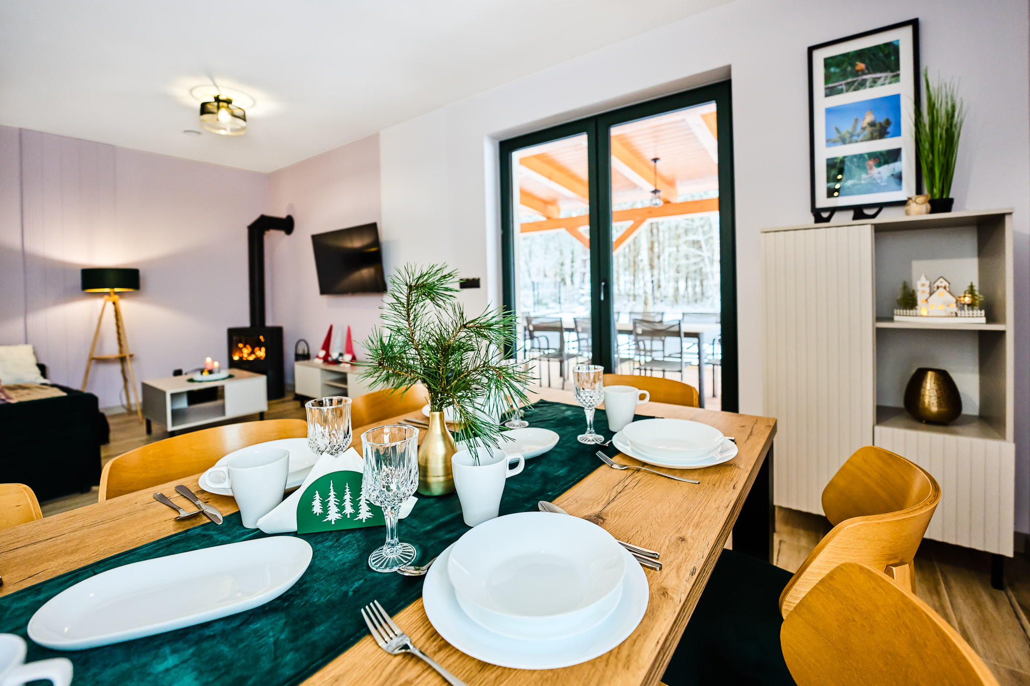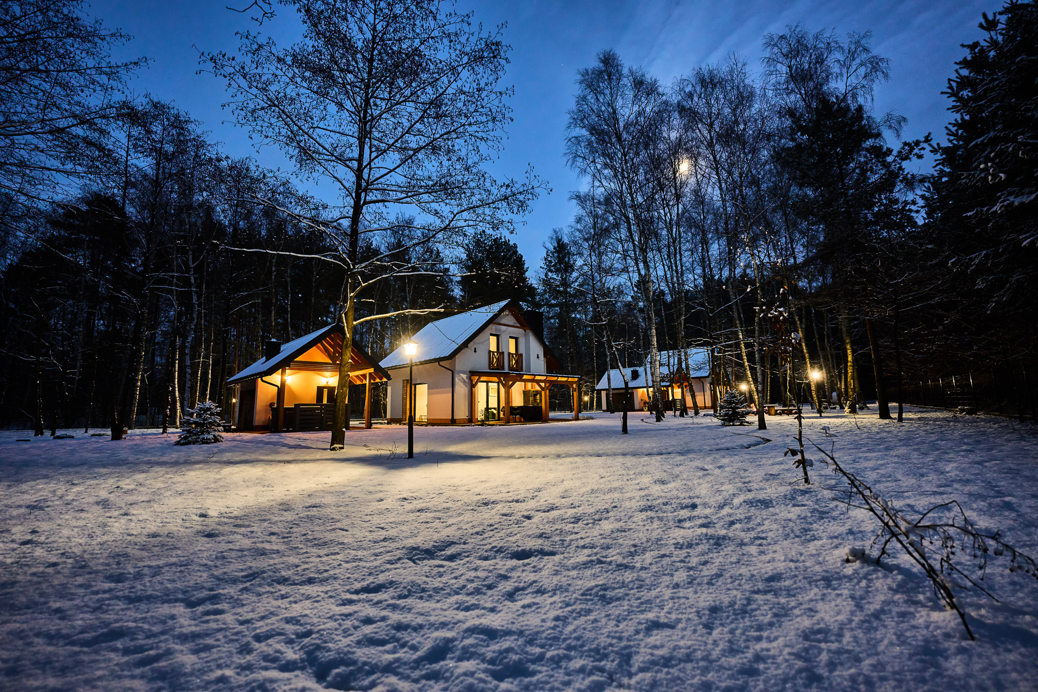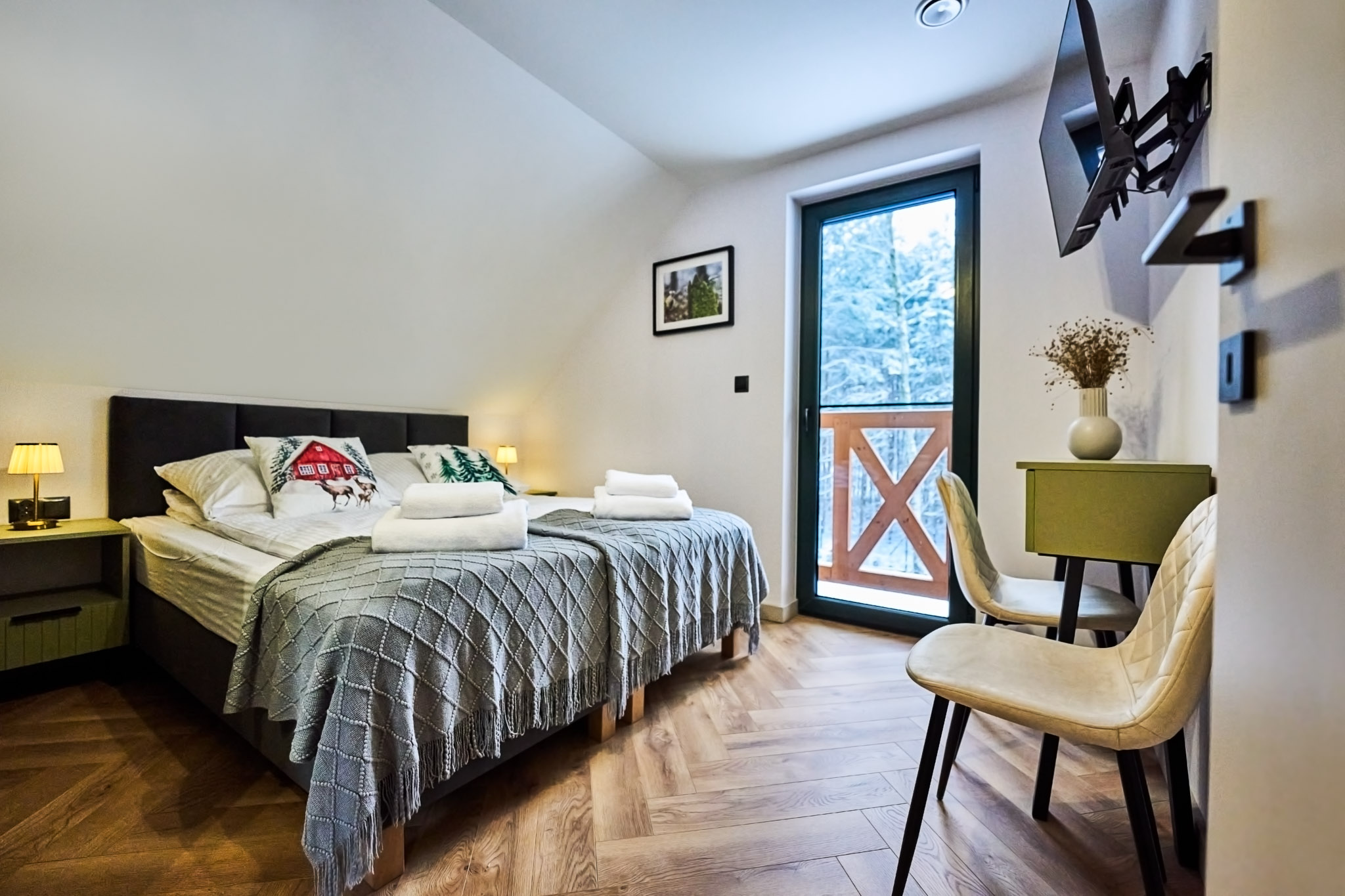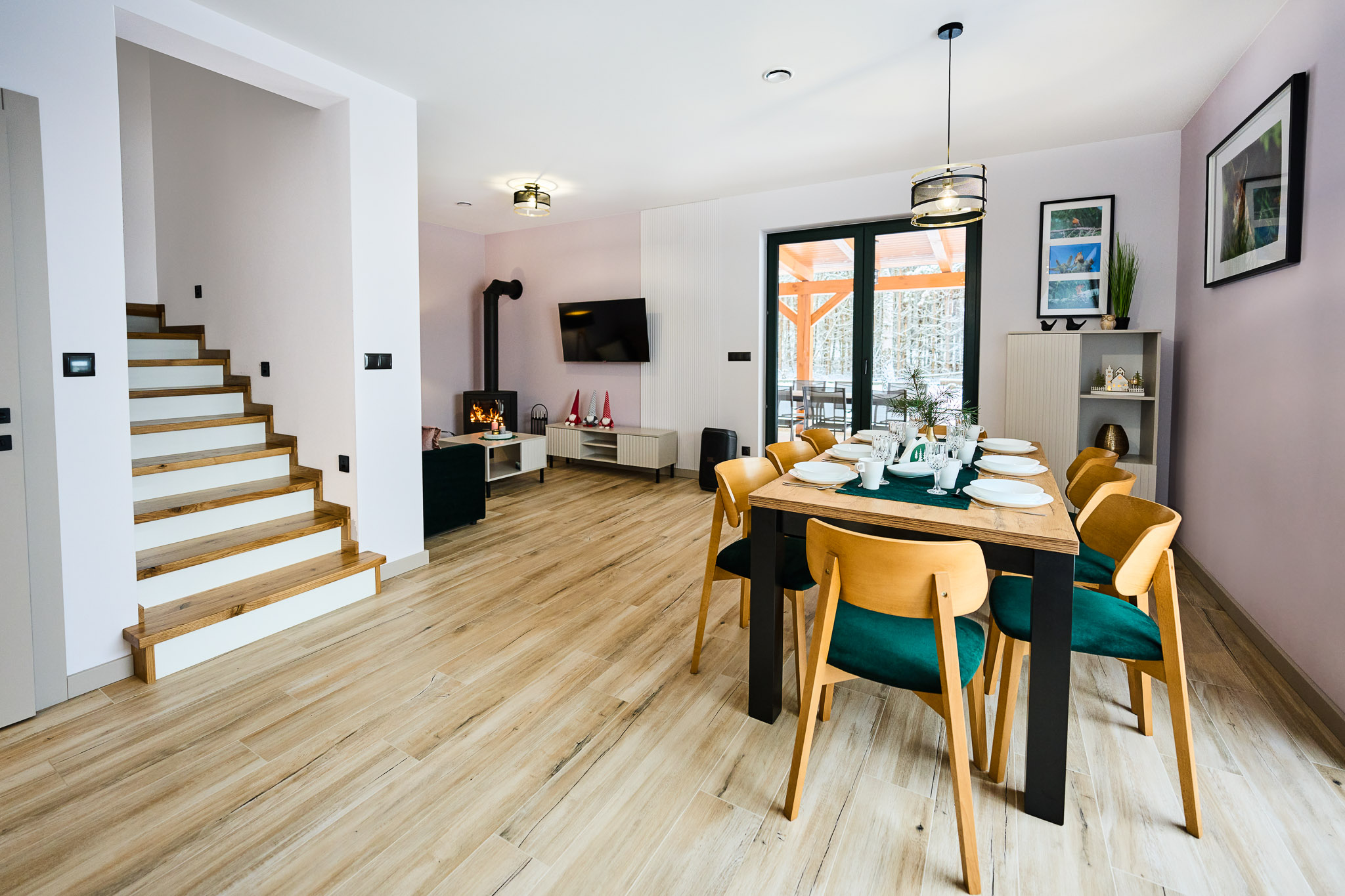 Przestronne wnętrza domków zapewniają wygodę, a ich stylowy wystrój doskonale komponuje się z otaczającą przyrodą, tworząc idealne warunki do odpoczynku i relaksu.