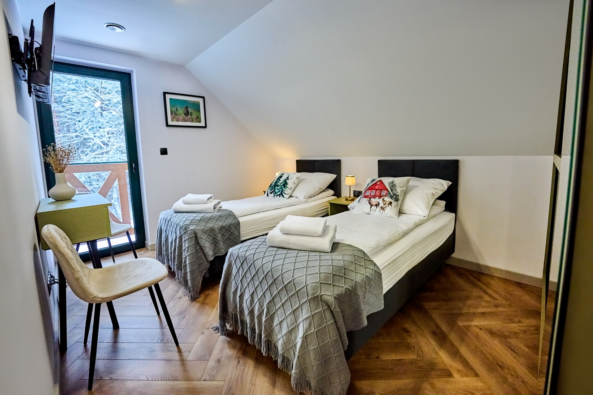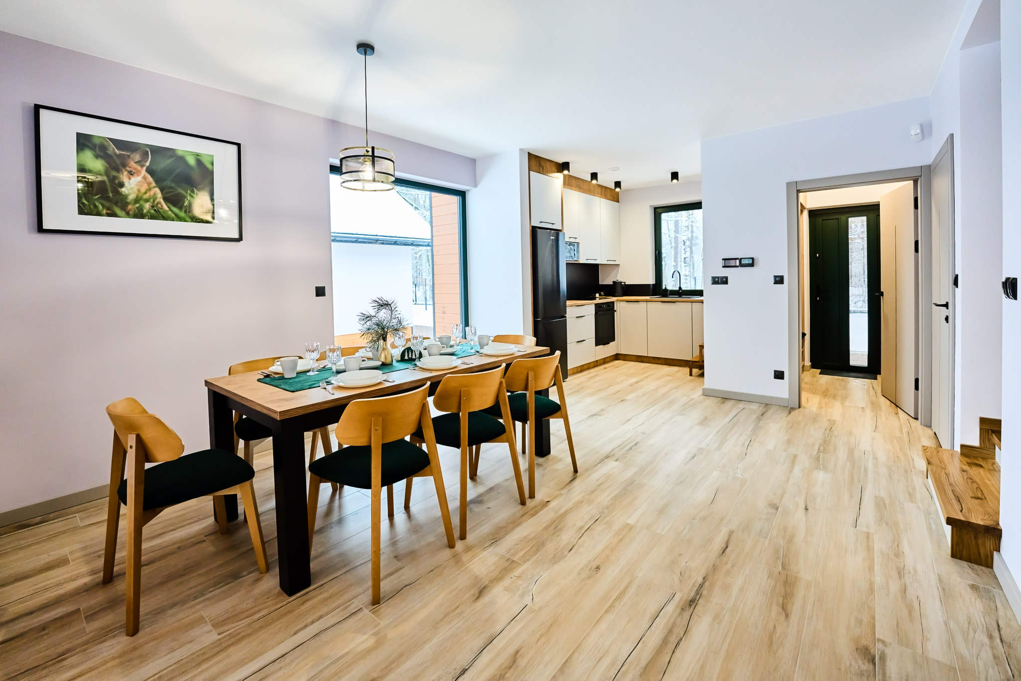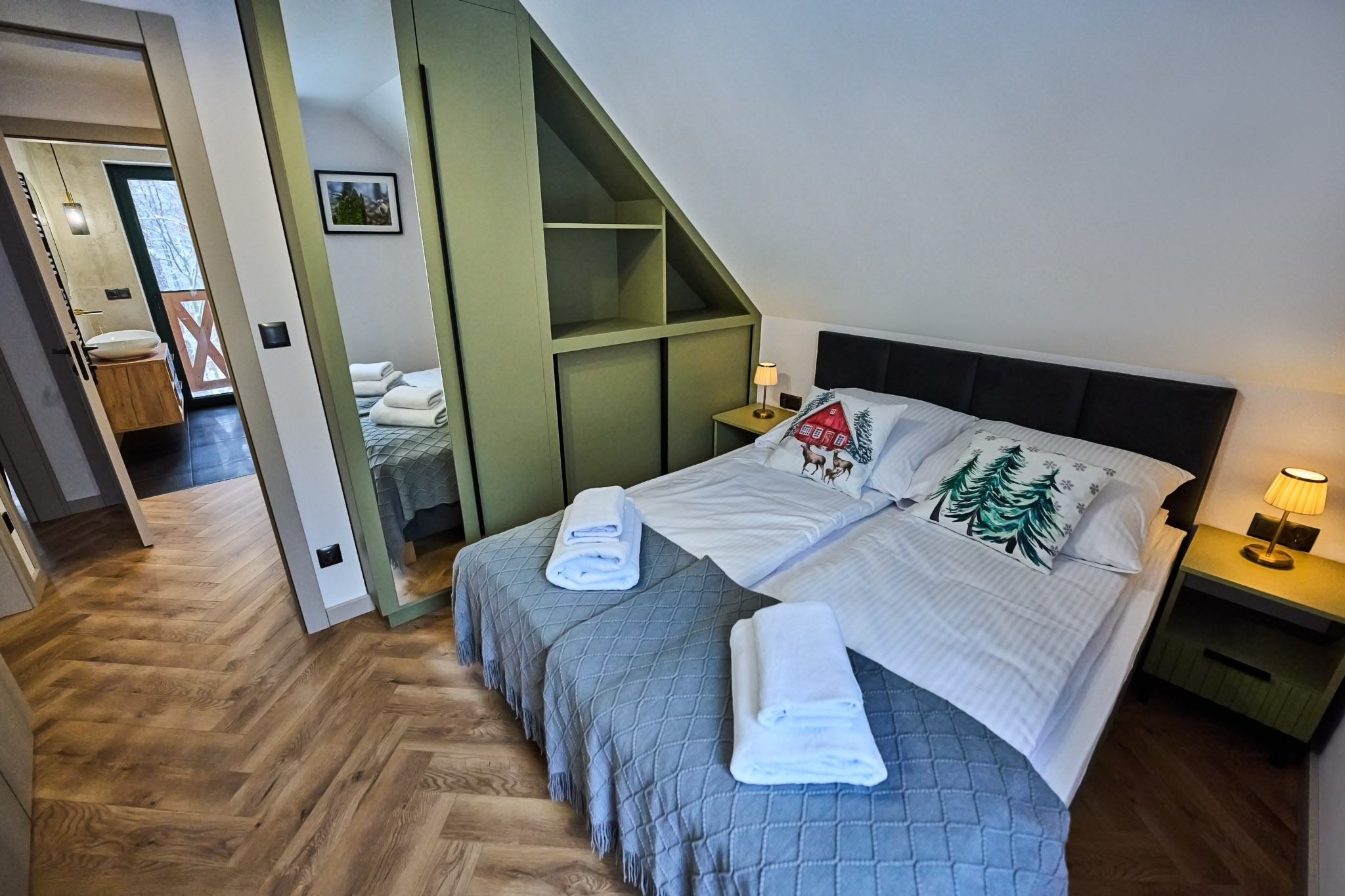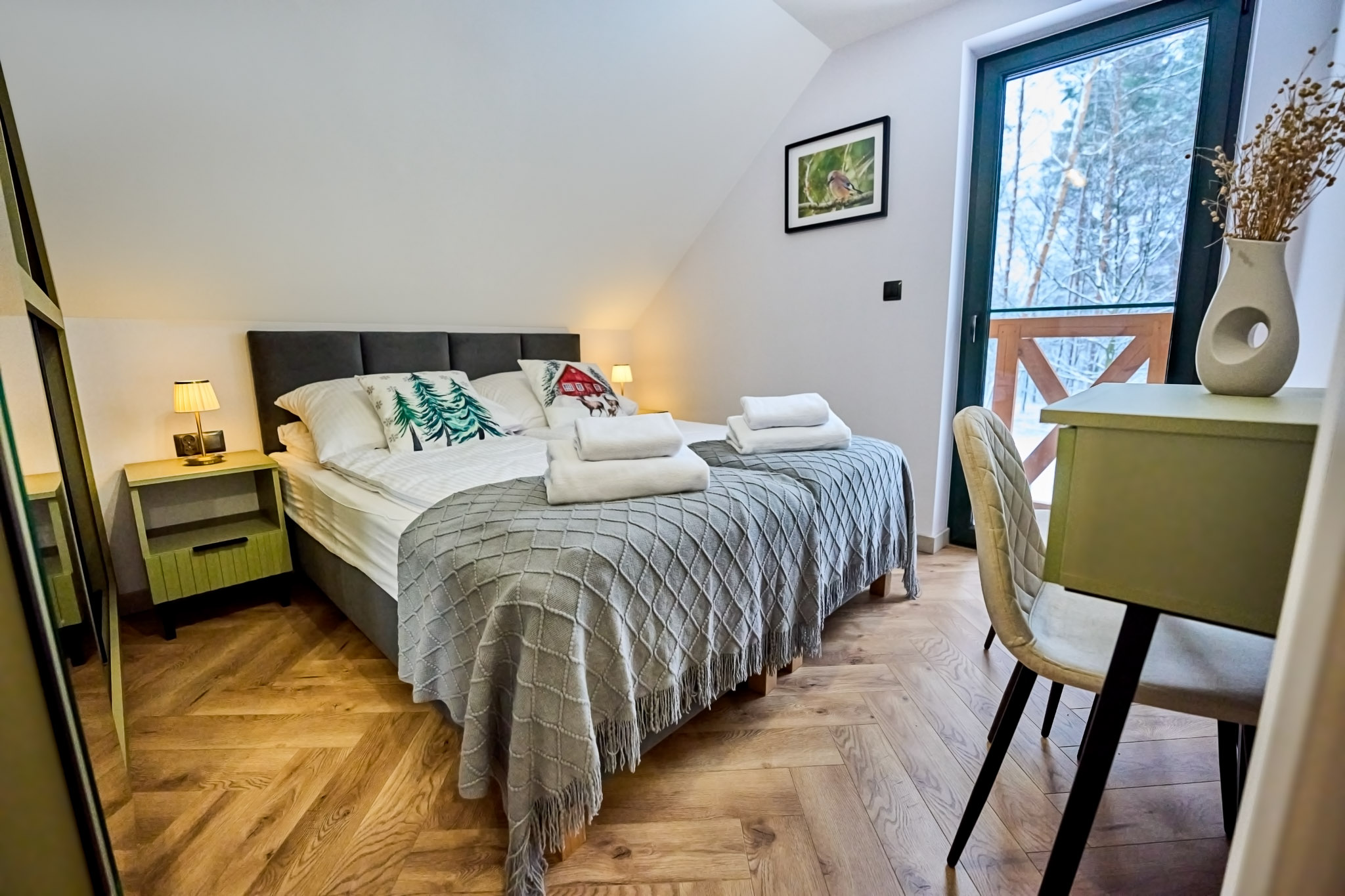 Przestronne wnętrza domków zapewniają wygodę, a ich stylowy wystrój doskonale komponuje się z otaczającą przyrodą, tworząc idealne warunki do odpoczynku i relaksu.