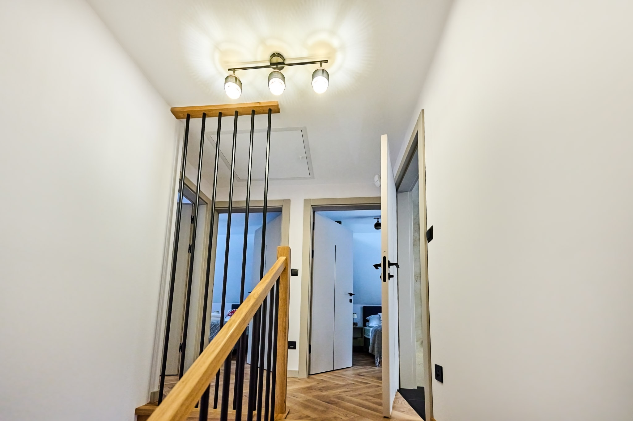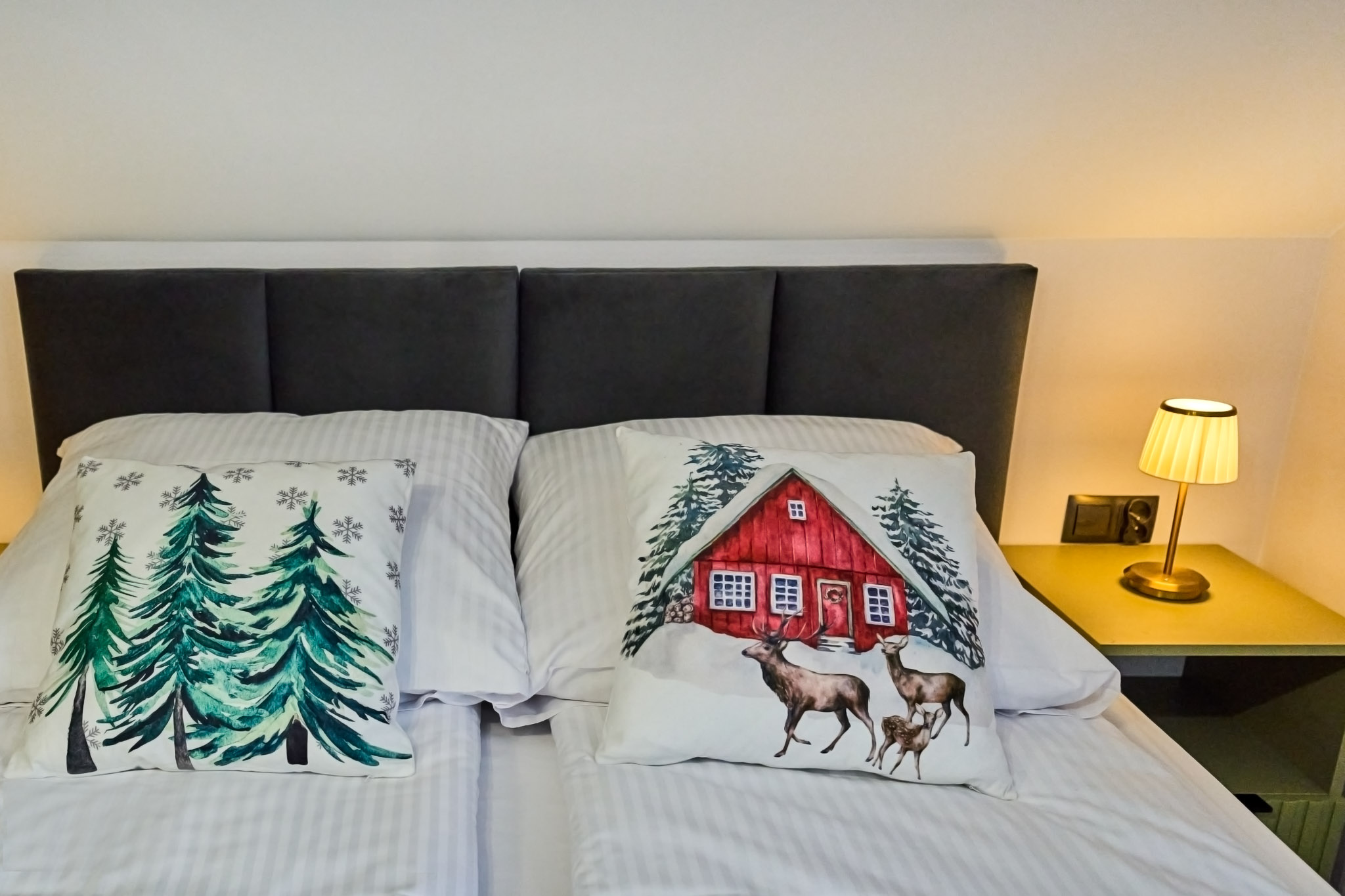 Wewnątrz są trzy sypialnie w których znajdują się hotelowe łóżka łączone – 6 miejsc noclegowych, a w salonie rozkładana 2-osobowa sofa.