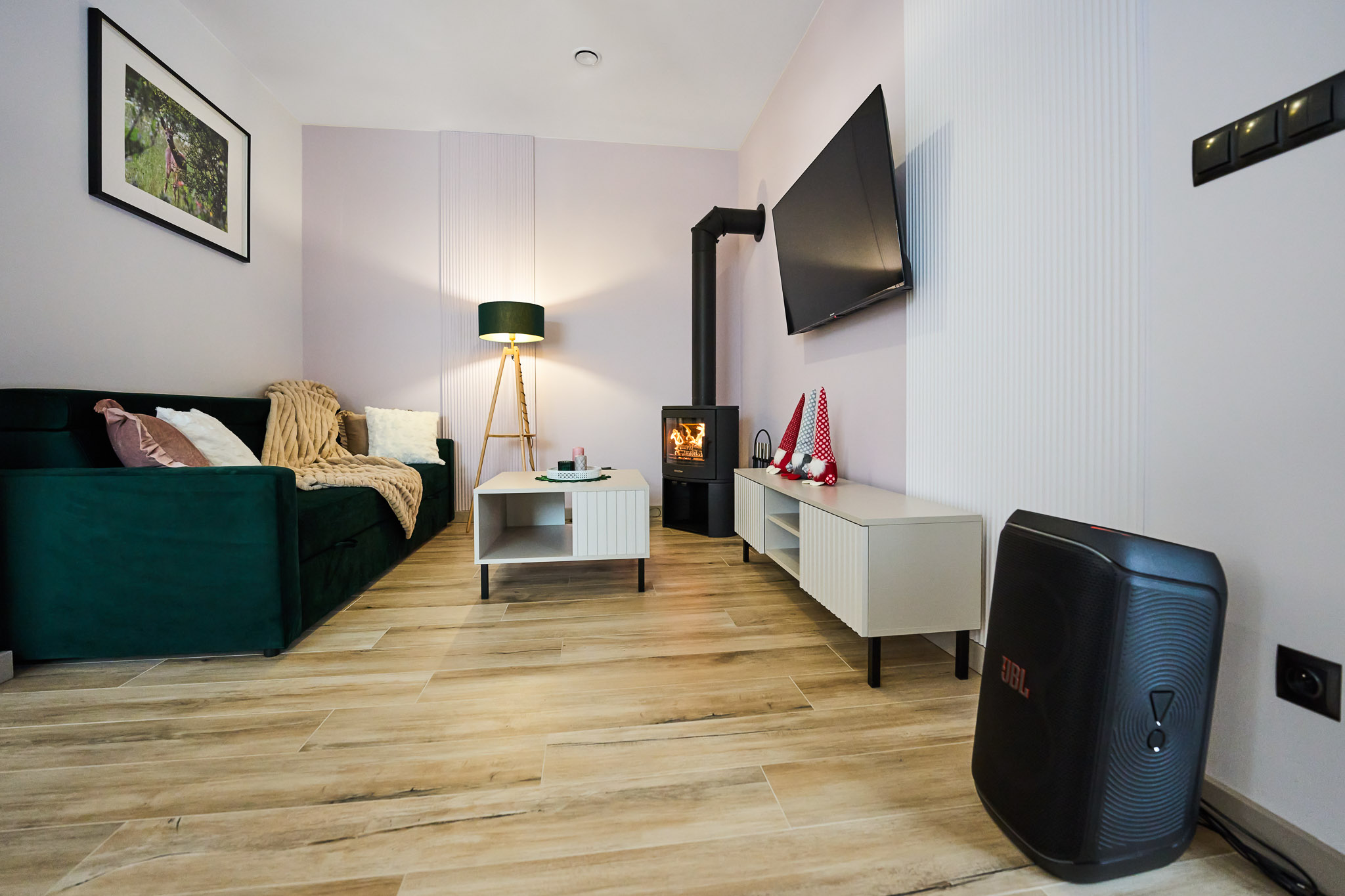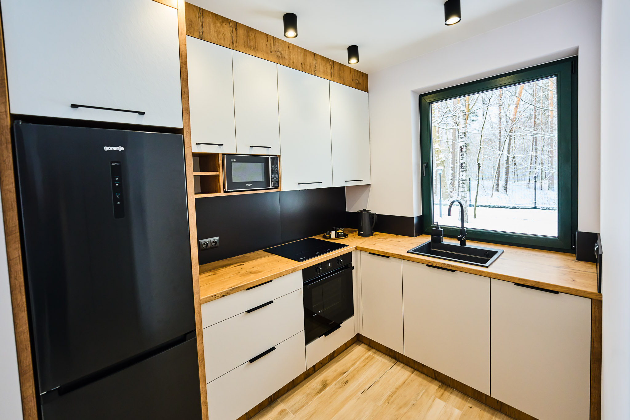 Na parterze jest salon z klimatycznym kominkiem opalany drewnem, jadalnia z dużym stołem oraz aneks kuchenny w pełni wyposażony w sprzęt AGD (lodówko-zamrażarka, mikrofala, płyta indukcyjna, piekarnik, zmywarka), garnki, zastawę stołową, sztućce.