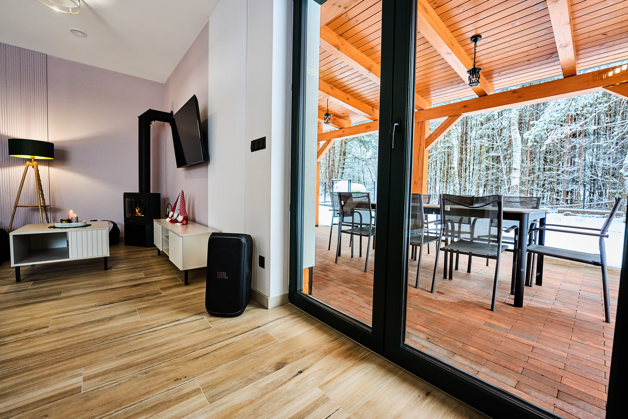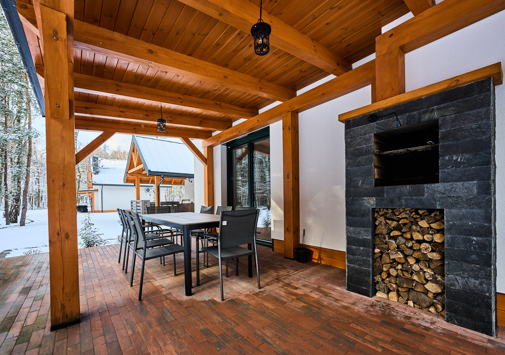 Na zewnątrz zadaszony taras z prywatnym grillem i dużym stołem idealny do długich biesiad na świeżym powietrzu, czy też do porannej kawki przy śpiewie ptaków.
